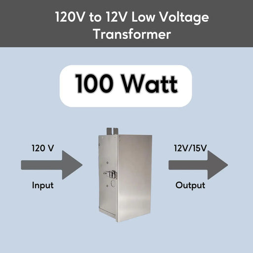 View full details100 WATT MULTI-TAP LOW VOLTAGE TRANSFORMER | 12 VOLT - 15 VOLT | STAINLESS STEEL FRAME FOR INDOOR AND OUTDOOR USE With our 100 Watt Multi-Tap Low V...