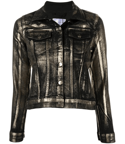 View full detailsMETALLIC COATED DENIM JEAN JACKET Description: The Madison Maison Denim Jacket in Gold and Black is a denim jacket with gold foil overlay foiling....