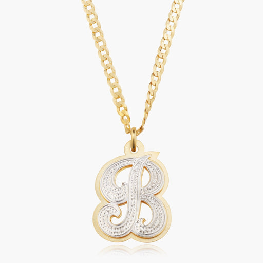 View full detailsDouble Plated Old English Initial Necklace makes a bold statement with its oversized gothic letter design, shimmering beaded texture, and rich doub...