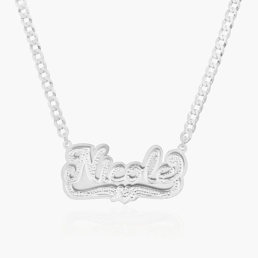 View full detailsThe Double Plated Sweetheart Script Nameplate showcases your name in elegant script with a bold heart detail, crafted in a two-layer gold finish f...