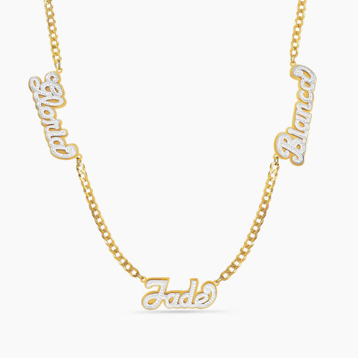 View full detailsOur popular "Double Plated Name Necklace" boasts a chic and elegant design, handcrafted to perfection. The model showcases the necklace with an 18-...