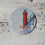 Car Coaster: Winter's Magic: Grand Haven Lighthouse. Artist Christi Dreese