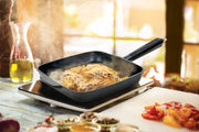 The MasterPan 11”x11” Heavy Duty Grill Pan can be safely used on any heat source, including induction. Use this top-tier ribbed grill to cook meats or fish on one side while frying vegetables on the other! Anyone who likes to save time while achieving delicious results at the same time will love the MasterPan cast aluminum Heavy Duty Grill Pan. Its thick base is specially designed to balance heat flow evenly, and it features a removable ergonomic handle for safe maneuvering. This safe, easy-to-clean cast aluminum grill pan provides a superior Xylan Plus double layer non-stick coating by Whitford—safe and durable for daily use and comes with a spacious 8” heavy gauge base heating plate suitable for any size cooking hob. Our products are dishwasher safe, as well as PFOA, heavy metal, and PFGA free.