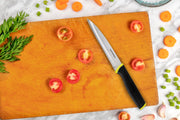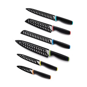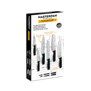 MASTERPANs beautiful 12-pc Knife set includes an 8" Chefs Knife, 7" Santoku Knife, 8" Bread Knife, 8" Carving Knife, 5" Utility Knife, 3.5" Pairing Knife and 6 safety blade covers. Everything you need to fulfill your daily kitchen prep needs. All the knives are made with a single piece of high carbon stainless steel with an ergonomic TPR material non-slip handle. We do not believe in using fancy words or descriptions such as “3-step method”, “12 degree edges”, “mirror polished cutting angle”, “67-layer”, “liquid nitrogen tempered”, “military grade handle”, “full tang”, “semi-stiff blade”, yada, yada, yada, to sugar coat our products. You do not need a blade that is going to split a hair in half, what you need is a sharp enough blade that will slice and dice all foods effortlessly which is what all our knives will do. By cutting out all this unnecessary jargon and the age old tradition of multiple middleman and retailers we contract manufacture all our knives directly with quality manufacturers and then sell them straight to you at an affordable price. We are committed to making a no-nonsense range of great quality professional kitchen knife sets at an affordable price that can be used and loved by everyone. Simply put – Amazing Quality at Affordable Pricing.
