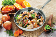 The MASTERPAN Chef’s Series 11” Fry Pan is built to benefit your relationship with food. Its ingenious 3-ply construction (stainless/aluminum/stainless) lasts significantly longer than your usual non-stick cookware, and can be used worry-free on any heat source, induction included, with mouthwatering results. This superior combination cooking surface boasts intelligent “snowflake technology” that rises above its superior non-stick surface—it is specially designed to balance heat distribution flawlessly throughout the entire pan, so you can sear and brown foods without the hassle of it sticking to the surface! The ILAG non-stick Swiss technology premium coating is PFOA, lead, cadmium, and heavy metal free, and scratch-resistant, so go ahead and use those metal utensils. The pan also features an ergonomically designed handle, and is dishwasher safe.