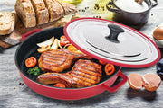 Introducing the one of a kind MASTERPAN Stovetop Oven Grill Pan with a 12" diameter. The only pan that has the features of an oven but can be used on a stovetop. Instead of waiting to heat up your oven and then baking your food for lengthy periods of time, use our stovetop oven to cook frozen foods and other foods you would put in the oven. Key Features of the Lid: * Stainless steel for longer lasting * Steam releasing, heat trapping lid has over 5000 laser etched holes that act as a splatter guard preventing hot oil splashing out, retain heat on the inside but releasing steam at the same time to avoid condensation on the inside. Creates the perfect oven-like feeling on the inside keeping fried food hot and crispy. * Lid can be used as a splatter guard for any other pot or pan between 8-12” as well. Works great for frozen foods without having to heat up a big oven just for frozen fish fingers or burgers. Ideal in re-creating an oven environment on camping trips and smaller homes with no ovens. 2 colors to choose from black or red.