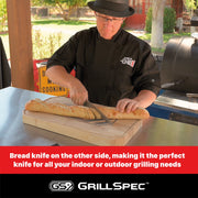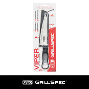 THE GRILLSPEC Viper Multi-Use Grill Knife is one of a kind design patented dual sided knife that has a razor sharp chefs blade on one side and a serrated bread blade on the other making it the perfect knife for all your indoor or outdoor grilling needs. Plus it has a turning fork tip to help flipping meats when your grilling plus a bottle opener for those thirsty afternoons. A chefs knife, a bread knife, a turning fork and a bottle opener, all in one. Need we say more. Oh, plus its made with a raised guard that keeps the blade elevated when laid on a flat surface so no messy tables. Comes with a plastic blade protector.