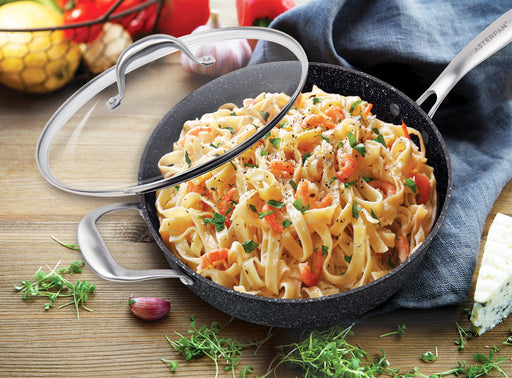 View full detailsThe MASTERPAN 5 QT. (11”) Non-Stick cast aluminum Saute Pan comes with a glass lid, stainless steel handles, and a top quality 2-layer premium san...