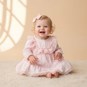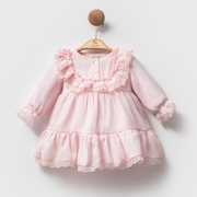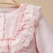 The Blush Lace Ruffle Baby Dress is a picture-perfect choice for your little one’s sweetest moments. Crafted from soft pink fabric with delicate dotted texture, it features charming ruffle details along the neckline and sleeves, intricate lace trim, and a tiered skirt for a graceful finish. Ideal for birthdays, family gatherings, or special photo sessions.