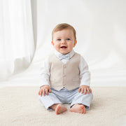 The John Set is the perfect choice for dressing your little gentleman in classic elegance. This special occasion outfit includes a crisp white long-sleeve shirt, a soft beige vest, and a stylish silver bow tie, paired with tailored light blue trousers. Made from a breathable blend of 75% cotton and 25% linen, it ensures all-day comfort and style. Ideal for weddings, birthdays, and family celebrations, the John Set will keep your baby looking sharp and photo-ready.