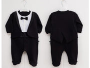 Make every occasion unforgettable with the Little Gentleman Tuxedo Baby Romper. Designed to look like a classic tuxedo, this one-piece outfit features a black jacket-style top, crisp white shirt front, bow tie detail, and built-in footies for extra comfort. Convenient snap closures make dressing and diaper changes simple, while the soft cotton fabric ensures your little one stays cozy. Perfect for weddings, birthdays, holidays, or photo shoots, this romper lets your baby shine in timeless style.
