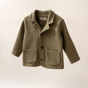 Keep your little one stylish and cozy with our Olive Knitted Button-Up Jacket. Designed with a textured knit fabric, classic collar, and front patch pockets, this versatile piece adds a touch of charm to any outfit. Perfect for layering during cooler days, it’s a timeless wardrobe essential that combines comfort with sophistication.
