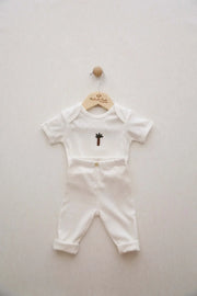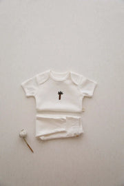 The short sleeve bodysuit showcases a charming palm tree design, complete with convenient snap closures for easy dressing and quick diaper changes. The matching pants provide a relaxed fit, allowing for plenty of movement during playtime or adventures.