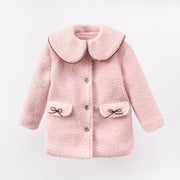 Wrap your little one in cloud-soft coziness. The Rosalie Coat Set is crafted in a plush bouclé with a classic button-front and oversized Peter Pan collar trimmed with delicate contrast piping. Two bow-topped pockets keep tiny treasures safe, while the matching bucket hat completes the picture-perfect look. Dress it up with the collar for special moments or wear the coat alone for every day—either way, it’s irresistibly sweet and snug.