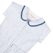 Ricrac trim adds a fun touch to our summer romper in a beautiful linen and organic cotton blend fabric. Features rounded peter pan collar, a button closure at the center front, decorative bow, and elastic waist for a comfortable fit and easy dressing for your girl. Side pockets and cuffed hems complete the look.
