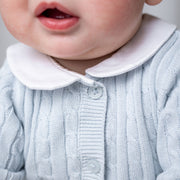 A delicate cable knit sets this sweater romper apart from the rest. Crafted from our luxuriously soft organic cotton, this one-piece features a sweet woven peter pan collar and a button front center closure. An easy, comfortable, and beautiful outfit in one. Makes a great baby gift or heirloom piece for your family.