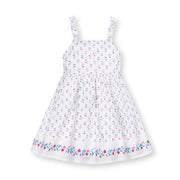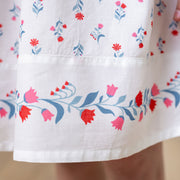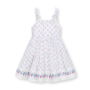 A beautiful printed border hem is the standout feature of our bow strap sundress for summer. Crafted from soft organic cotton in a pretty floral print, this dress is fully lined in organic cotton and has a button closure down the center back. A perfect piece for picnics and parties alike.