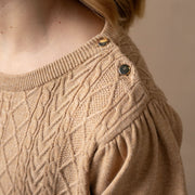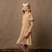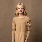 Meet one of our newest fall obsessions for girl - this perfectly put-together dressy sweater dress in soft organic cotton. Features beautiful leg of mutton sleeves, cable knit on the front and back bodice, a small waist bow, and gold buttons at the shoulder placket for easy dressing. An absolutely darling look she's sure to love.