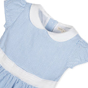 Our adorable dress in soft organic cotton seersucker features an adorable peter pan collar to frame her face with simple charm. Features a woven collar, puff cap sleeves, and a pleated waist sash with buttons and bow at the center back. Fully lined in cotton and ready for picture perfect moments!