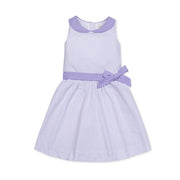 Summers iconic, preppy fabric is fashioned into a darling dress with feminine flair. Features organic cotton seersucker, a shirred waist, contrast peter pan collar and waist sash, and pearlized button closure down the center back. Fully lined in 100% organic cotton and ready for all the twirling that summer will bring.
