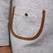 - Faux suede elbow patches and trim at pockets. Bow detail at neckline functional front pockets with gold button detail.