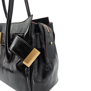 A distinctive gold-tone bar detail across the front adds a touch of understated luxury, catching the light as you move. The polished black leather and subtle gold hardware create a versatile accessory that transitions effortlessly from the boardroom to a chic evening out.