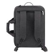 Briefcase transforms into backpack. Fully padded laptop compartment. Internal iPad®/tablet pocket. Large front pocket with organizer section. Two front quick access pockets. Padded carry handles with magnetic snaps. Removable/adjustable shoulder strap. Hideaway padded backpack straps for added comfort.