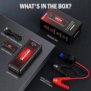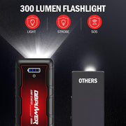 PORTABLE AND MULTIFUNCTIONAL: The size of our portable car jump starter is 8.7 *3.5 *1.6 inches, the weight is 1.56lb, which makes it portable in your car emergency kit, glove box, or even bag. It also comes with a super bright LED light with 3 modes (lighting/flash/SOS), which is used as an emergency flashlight with strobe and SOS signal. This multi-purpose flashlight is great for camping, outdoors, indoors, travel, etc. It can help you in any situation