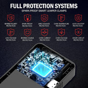 SAFETY PROTECTION SYSTEM: This portable car jump starter is very safe and easy to use. The all-metal jumper clamps are designed to be sturdy and durable, it provides versatile protection systems including low/high voltage, over-temperature, short-circuit, reverse polarity and jump starter time out protection, without the worry of incorrect connections or sparks. The excellent conductivity and durability can start your battery quickly and safely, even in extreme temperatures (-4°F~140°F)