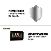 • Designed with stainless-steel materials, this fireplace ensures long-lasting performance, even in challenging outdoor conditions. Enjoy cozy evenings with a fireplace that’s built to withstand the elements.