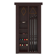 30" to 34" - 9 pool cues, 36" - 11 pool cues - 2 Pool ball shelves hold 16 pool balls