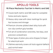 The perfect tool set for home projects, Apollo Tools’ new and improved 95-piece mechanics tool kit contains all the sockets, wrenches, and pliers needed for small engine and other mechanical repairs in metric and SAE.