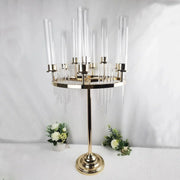 Set the stage for an enchanting evening with the 9-Arm Candle Holder Wedding Table Centerpieces, an embodiment of grace and timeless elegance. With a height of 36.6 inches, these centerpieces command attention, casting a romantic light across your venue. Each arm is adorned with an acrylic tube, designed to beautifully house your choice of taper candles, while the luxurious gold finish of the electroplated metal frame adds a royal touch.