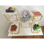 Catering businesses can purchase this dessert table display stand set to enhance their event setups, offering clients a touch of elegance with gold cube risers. These stands are not only beautiful but also durable, ensuring they can be used repeatedly, making them a great investment for event rentals.