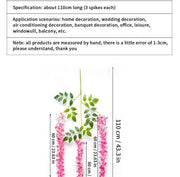 Wisteria artificial flowers blush leaf connections are firmer, flowers denser and more natural. Artificial Flowers Vines size of each fake flower vine about 3.6 Feet in length. Wisteria artificial flowers bulk per artificial wisteria with 3 branches, every branches flowers length is 19.5 inches.