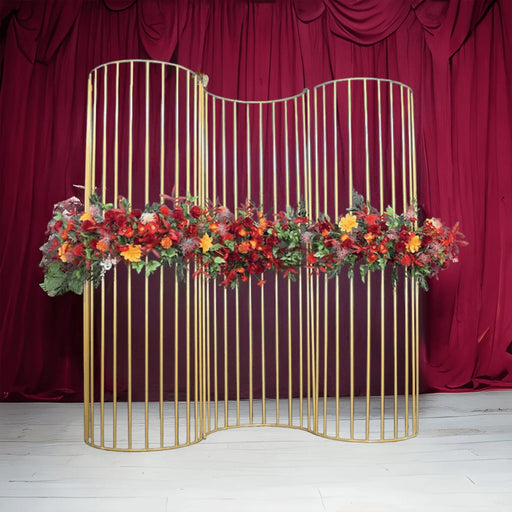 View full detailsSize: 6.5ft/78.7" tall x 30" wide.Color: Shiny Gold.Sold as one piece.Flowers and other decor are not included with this purchase.This fencing line...