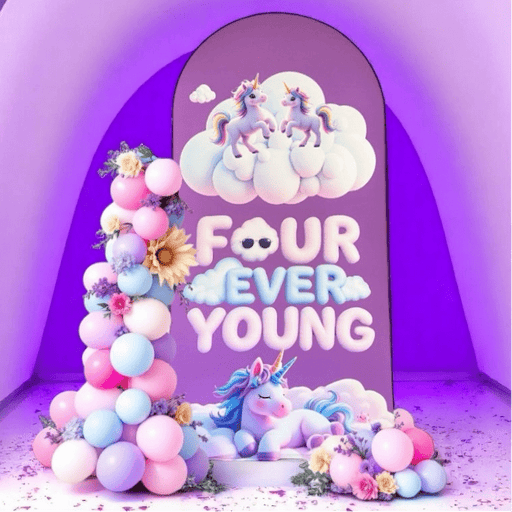 View full detailsTurning four just got a whole lot cooler. The Four Ever Young Fabric Arch Cover is your go-to backdrop for stylish, fun, and unforgettable 4th birt...