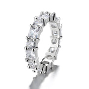 The ring has a timeless and classic design that combines the elegance of round-cut crystals with the modern look of square-cut crystals, creating a unique and eye-catching pattern. The band is designed to be comfortable and is available in a range of sizes to ensure a perfect fit.