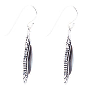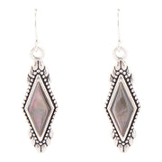 Black mother of pearl shimmers in a diamond shape surrounded by delicate sterling silver. Earring is 1.5" long including ear wire.