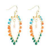 Indulge in the beauty of these Apricot Teals Multicolor Golden Statement Earrings. Handcrafted with genuine blue magnesite, orange agate, and green jade, these earrings measure 2.12" in length and 1.43" in width at its widest point, weighing a total of 7.4g. Each piece is carefully crafted and finished by hand using 18K gold plated brass, adding a touch of elegance to these beautiful earrings.