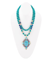 This stunning necklace features a bronze statement pendant with blue apatite and blue turquoise. Beautifully beaded with agate and magnesite, the necklace measures 16 inches with a 2 inch extender chain and is secured with a lobster clasp. The pendant, measuring 4 inches in length and 2.5 inches in width at its widest point, lends a statement-making touch. Handcrafted with care, this necklace weighs 5.6 ounces.