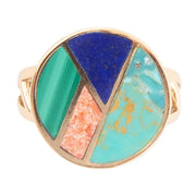 Indulge in vibrant elegance with this Art Deco Colorful Inlay Golden Ring. Adorned with genuine lapis, turquoise, sponge coral, and malachite, this ring showcases a beautiful mix of gemstones. Made with genuine bronze, its top measures .75" x .75" and weighs 4.5 grams. Elevate your style with this stunning piece!