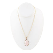 Experience the beauty and craftsmanship of Aruba Pink Opal Golden Pendant Necklace. Handcrafted from genuine bronze and finished with genuine pink opal, this pendant necklace weighs 17 grams and pendant alone measures 2" in length (including bail) and 1" wide. The necklace is adjustable from 16" to 18" with a 2" extender chain, making it the perfect fit for any occasion. Fall in love with the exquisite detail and artistry of this one-of-a-kind piece.
