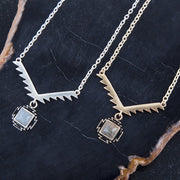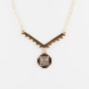 This Genuine Labradorite and Bronze Aztec Necklace is a unique work of art crafted entirely by hand. The rare, genuine labradorite gemstone is placed in an oxidized bronze bezel for a stunning contrast. 16" + 2" extender in length with lobster clasp closure ensures the perfect fit. Wear this one-of-a-kind piece to make a statement.
