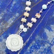 Elevate any outfit with our stunning Blue Amazonite Rosette Sterling Necklace! Crafted with genuine amazonite and sterling silver, this hand-carved rose pendant is a symbol of elegance and beauty. The necklace is adjustable from 16" to 18" with a 2" extender chain, making it perfect for any neckline. Feel confident and radiant wearing this 1.5" x 1.5" pendant. Necklace weighs 47 grams.