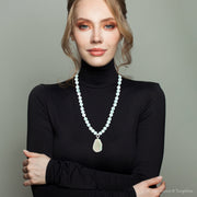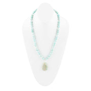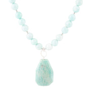 Hand-crafted and adorned with genuine blue amazonite beads, this necklace features intricate sterling silver detailing. It measures 25.75" in length with a 2" chain extender and a secure lobster clasp. The stunning pendant is also made of a genuine blue amazonite, measuring 2.25" long and 1" wide at its widest point, adds a touch of elegance and weighs 83.6g in total. Perfectly crafted and finished by hand, this necklace is a unique and luxurious addition to any jewelry collection.