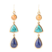 Blue Lapis, Turquoise and Orange Sponge Coral Golden Drop Earrings