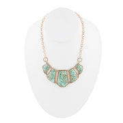 Indulge in the stunning beauty of this authentic turquoise and golden-toned statement necklace. Featuring an adjustable length of 15" - 17" with a 2" extender chain and a secure lobster claw closure, this 36-gram necklace is a must-have for any jewelry collection. The intricate roped detailing on the front, measuring 4" wide, adds a touch of elegance and sophistication.
