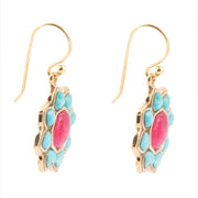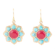 Blue Turquoise and Red Quartz Flower Golden Earrings