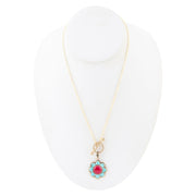 Experience the beauty and elegance of our handcrafted necklace made with golden bronze and adorned with a stunning flower pendant featuring blue turquoise and red quartz. With a length of 18.5" and a pendant width of 1.5", this necklace is the perfect addition to any outfit. Weighing a total 13.9g, it is both lightweight and durable.